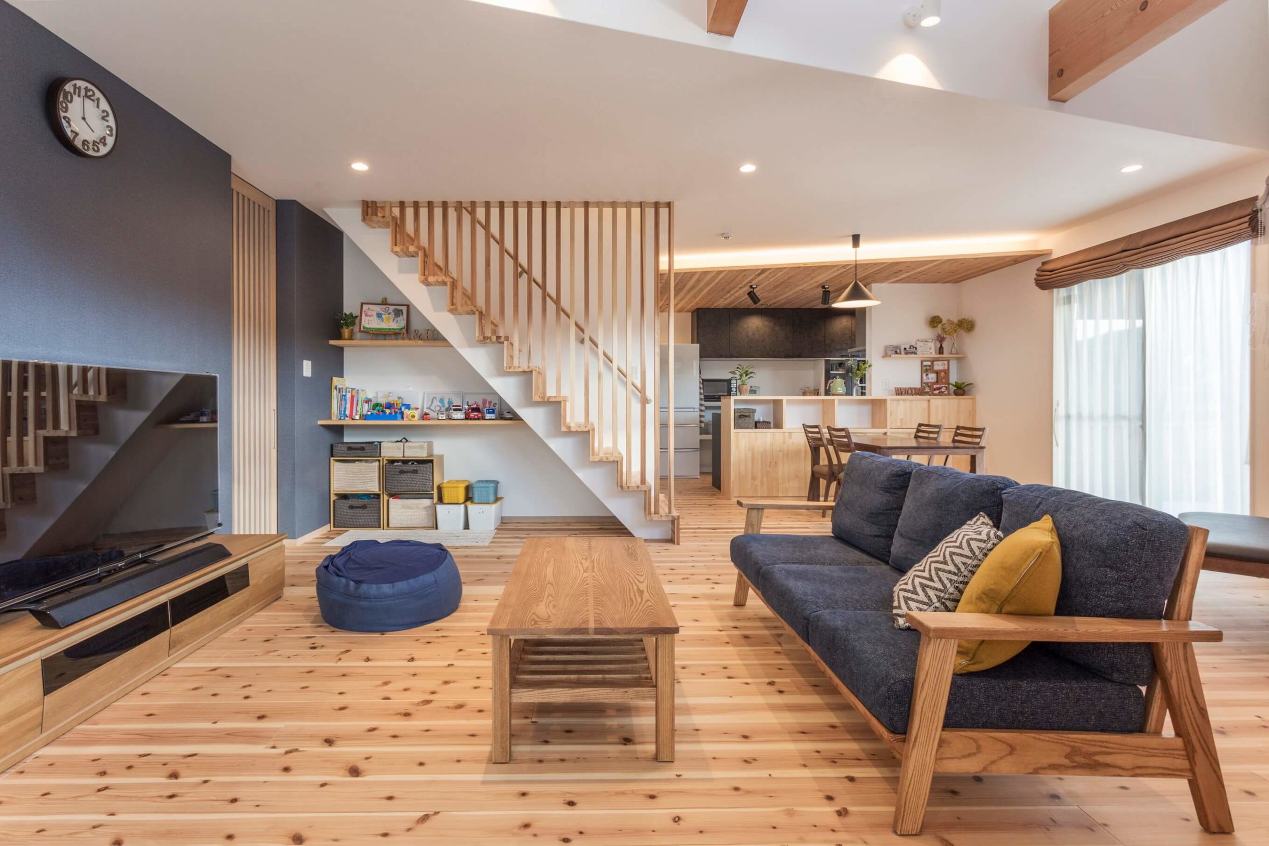 杉板で統一された室内は温もりを感じられ、歩行感も良いのでお子さんが走り回っても安心なんだそう。また、階段下スペースも三角を意識した設計となっています。
