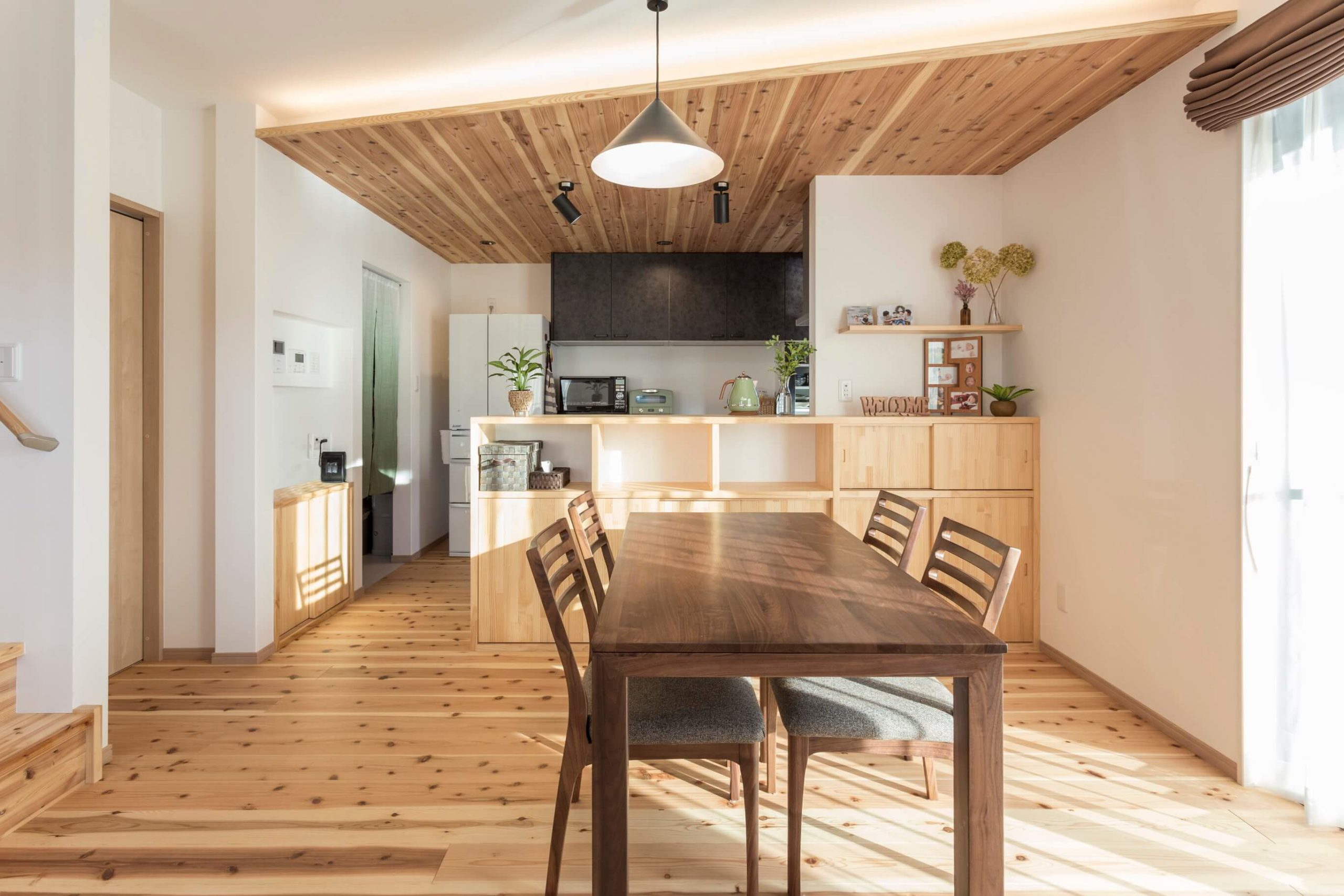 キッチンカウンター収納はディスプレイを兼ねるため⼾がない部分も。スポットライトは⿊として空間に締まりをもたせています。通路側ニッチ及び下部収納、間接照明、杉板張りの天井と奥様の思いを一つ一つカタチにしていきました。