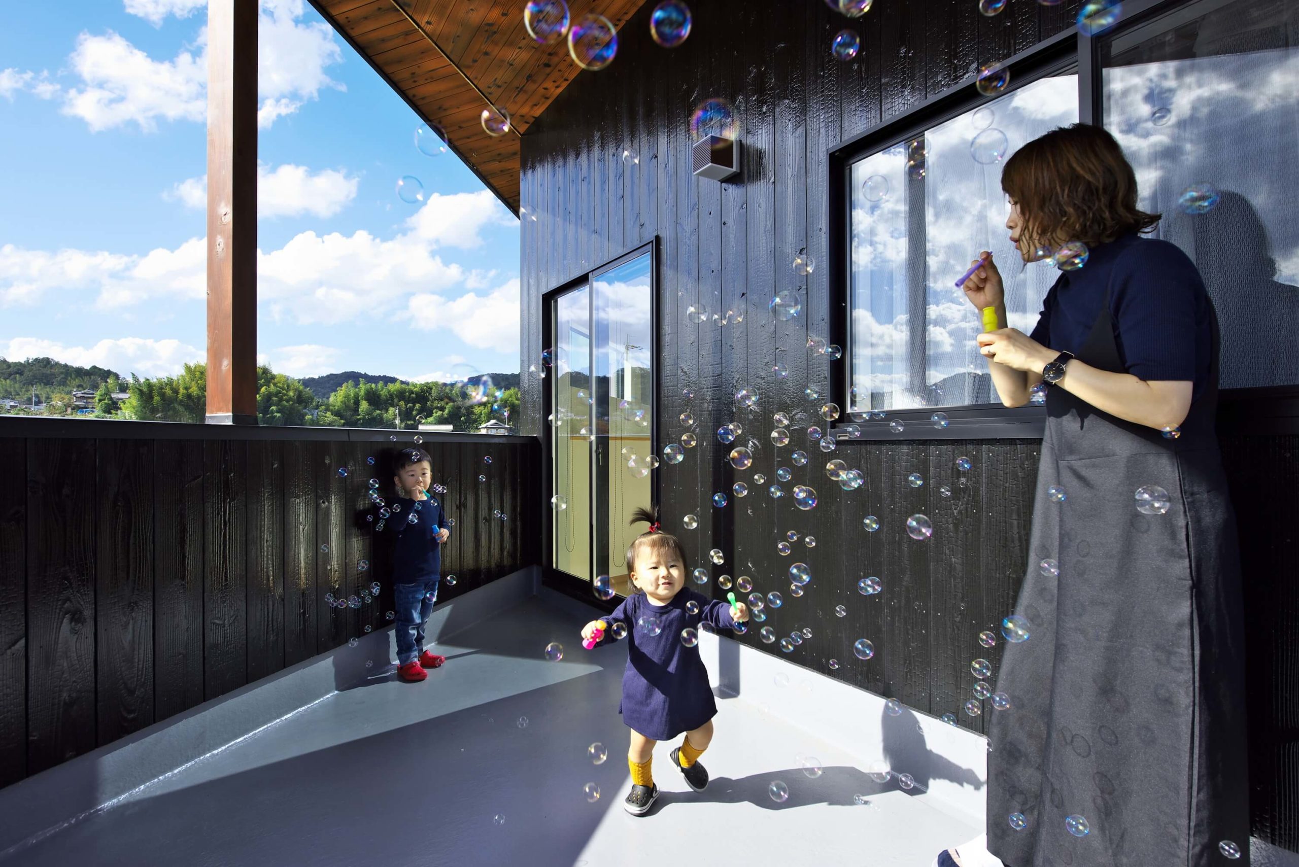 二階多目的スペースから続くベランダには心地よい風が吹き抜ける。