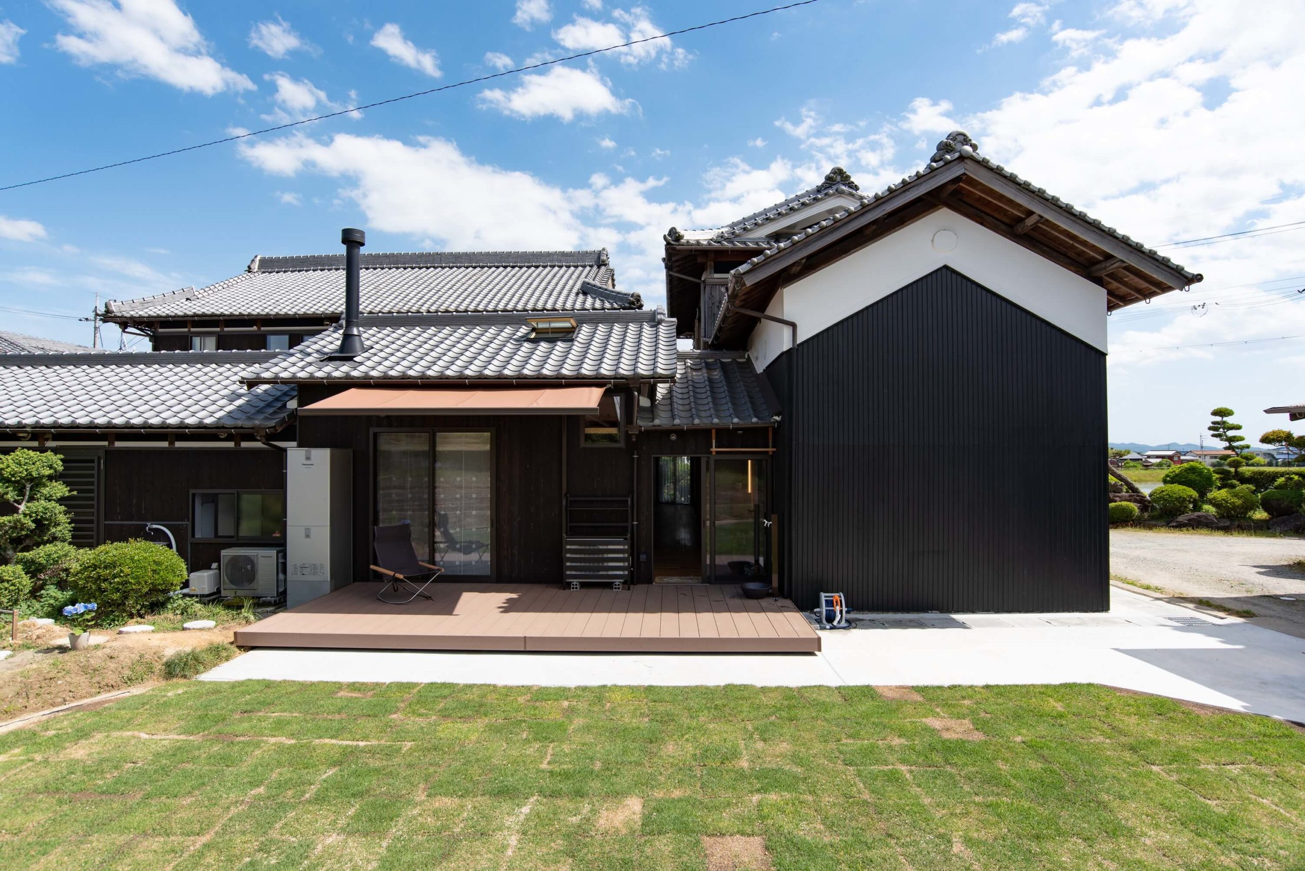 もともとは田んぼがありジメジメとした場所であったが、広々とした庭へと造成。ウッドデッキとオーニングから、ご主人のライフスタイルが垣間見える。