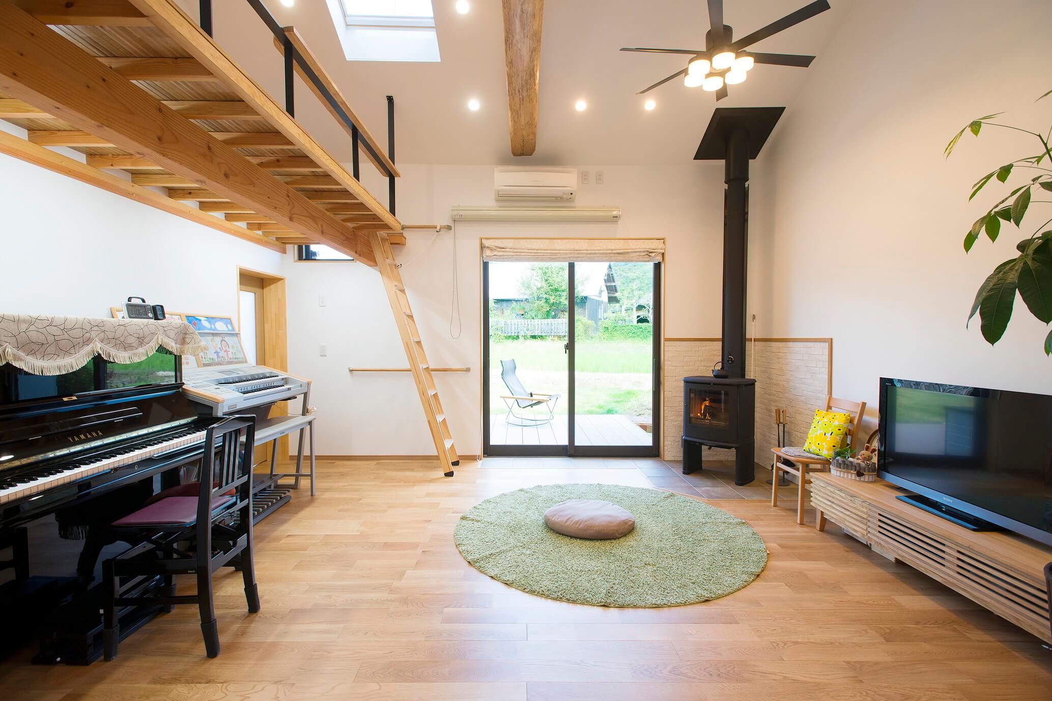 「北側配置でも暗くならないように」が設計の第一条件。勾配天井からのトップライトが絶大な効果をあげている。また夏の涼しさと引き換えに問題となる冬の寒さを、薪ストーブの導入により見事に解消しており、奥様の音楽教室も季節を通して快適だとか。