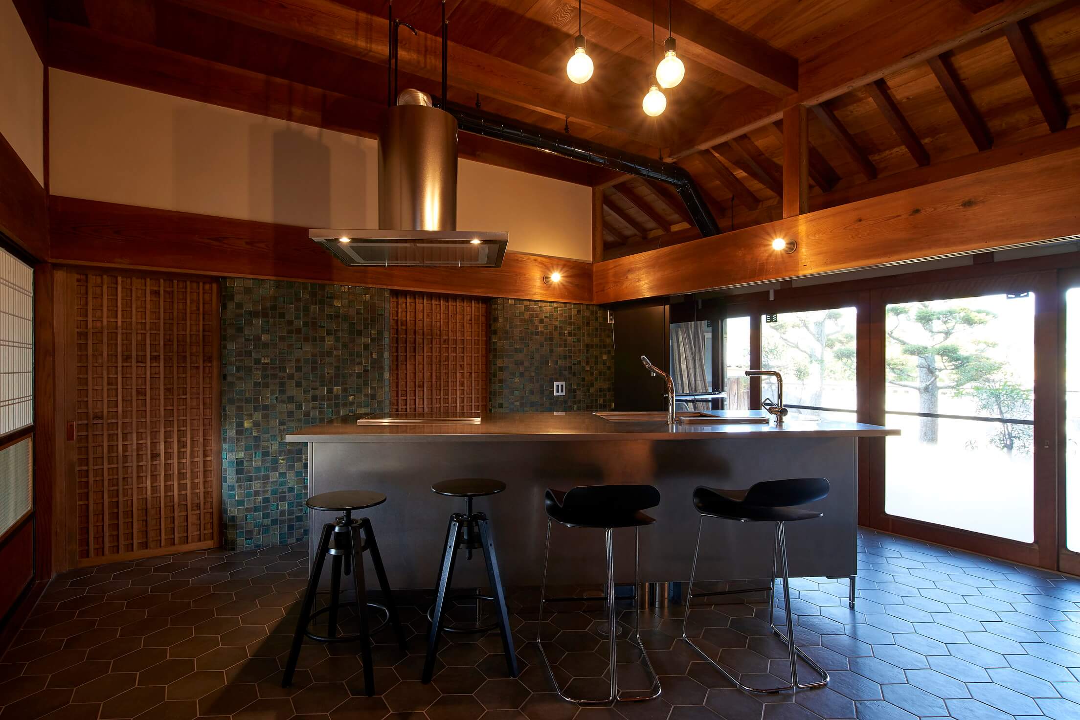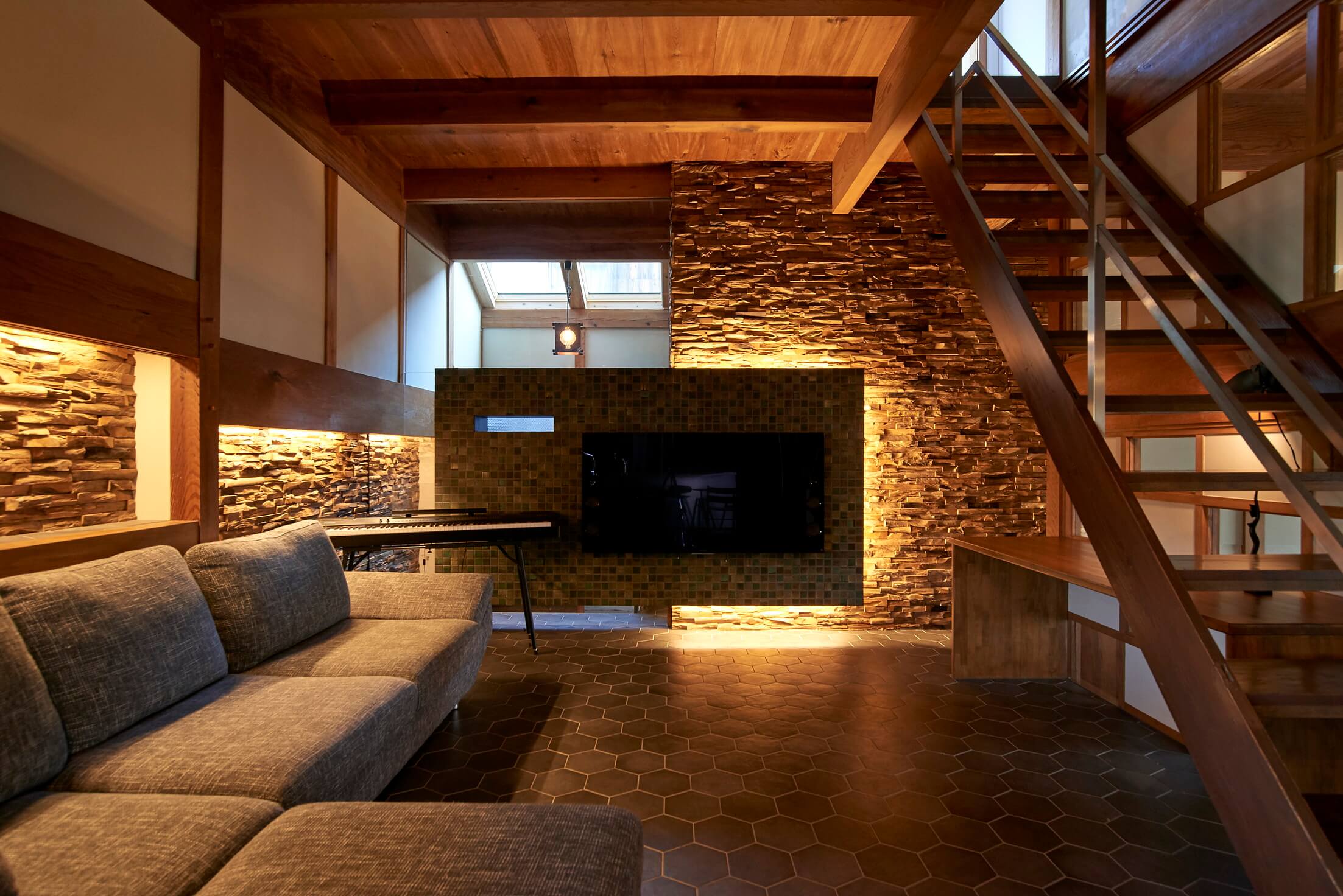 2つの奥の間を1部屋としたリビング。主要構造材をタイルや手摺などの無機質材と組み合わせることにより、懐かしいようで新しい空間となるようデザインしました。
